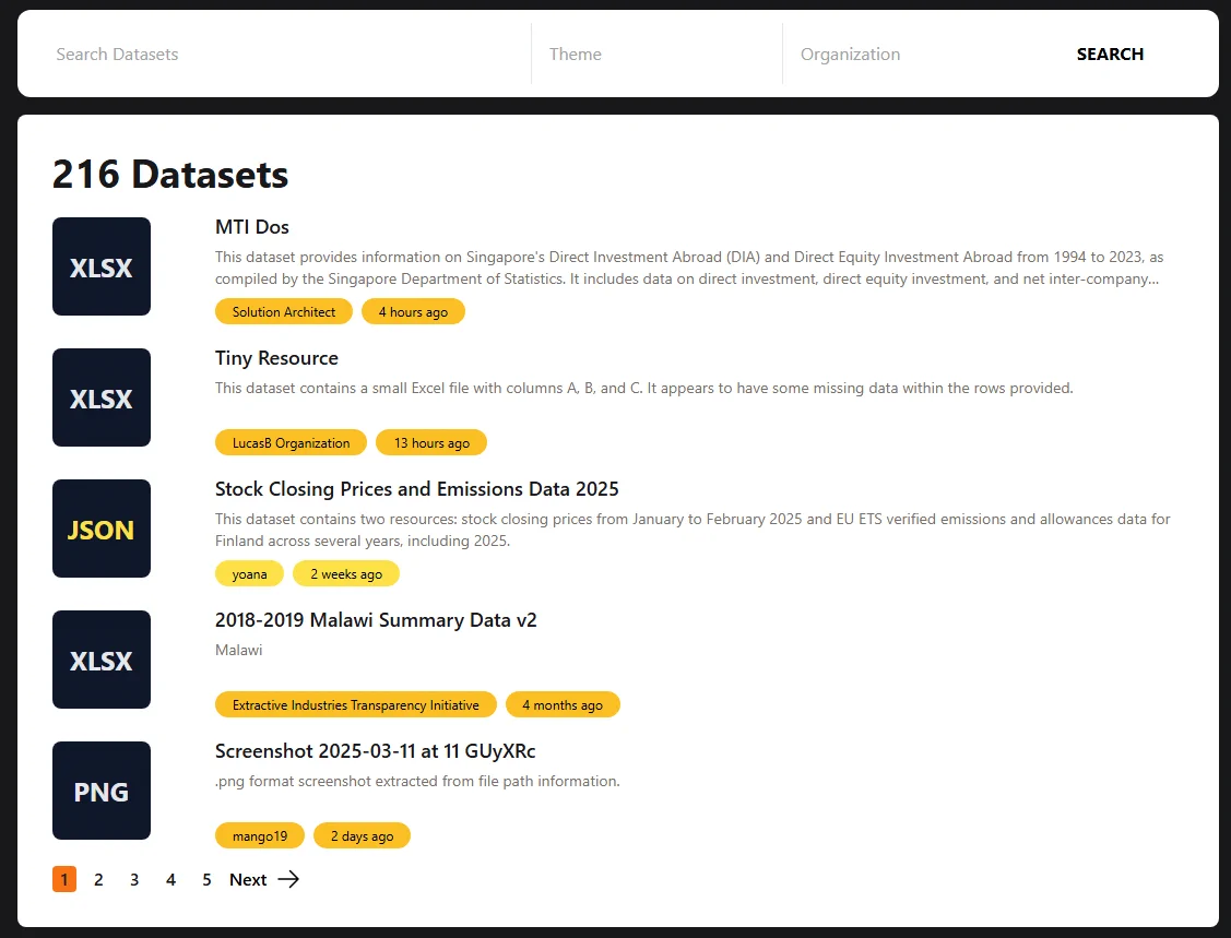 getDatasetsList()- Gets a list of all the datasets in the portalgetDatasetsListWithDetails(options: DatasetListQueryOptions)- Gets a list of all the datasets including their respective resourcespackageSearch( options: PackageSearchOptions )- Callspackage_searchgetDatasetDetails(datasetName: string)- Callspackage_showgetDatasetDetails(datasetName: string)- Callspackage_activity_listand automatically fills in the user informationgetUser(userId: string)- Callsuser_showgetGroupList()- Gets all the groups in the backendgetGroupsWithDetails()- Gets all the groups in the backend with detailsgetGroupDetails(groupName: string)- Gets all the details from a single groupgetGroupActivityStream(groupName: string)- Get a group activity list and automatically fills in the user informationgetOrgList()- Gets all the orgs in the backendgetOrgsWithDetails(accrossPages?: boolean)- Callsorganization_list?all_fields=True. If you setaccrossPagestotrue, it will repeatedly call the API until all groups are returned.getOrgDetails(orgName: string)- Gets all the details from a single orggetOrgActivityStream(orgName: string)- Gets a org activity list and automatically fills in the user informationgetAllTags()- Gets all tags in system with detailsgetResourcesWithAliasList()- Gets all the resources in the datastore that have an alias assigned to themdatastoreSearch(resourceId: string)- Calls datastoreSearchgetResourceMetadata(resourceId: string)- Callsresource_showgetResourceMetadata(resourceId: string)- Callsdatastore_infoon a resourcegetFacetFields(field: string)- Gets the possible values eg: getFacetFields("tags") will get you all the tags that are currently assigned to a dataset + how many datasets have that particular tag.